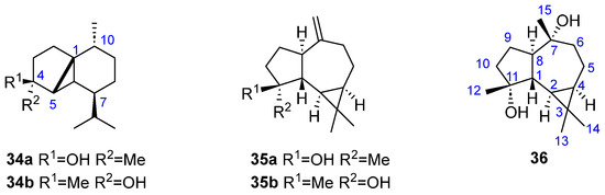 Five tricyclic sesquiterpenoids have been isolated and described from brown algae (Figure 8). Two of them, (−)-cubebol (34a) and its epimer 4-epi-cubebol (34b), were isolated in 1994 from T. atomaria collected from the North Adriatic Sea and both have a C-C bond between the C1 and C5 atoms of the cadinane skeleton, forming a third ring of three members, and carrying a hydroxy group in C4 position [16].
