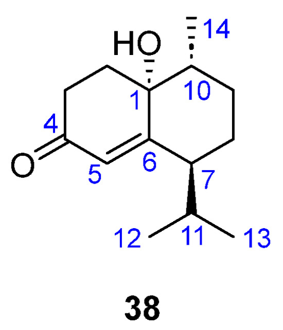 (−)-(1R,7S,10R)-1-Hydroxy-15-norcadinan-5-en-4-one (38) was isolated from Dictyopteris divaricata (Figure 10). This norsesquiterpenoid may be biogenetically derived from the oxidation of cadinane compounds as it can be seen as a dioxygenated in C1 and C5 cadinane molecule that has lost the C15 methyl (see in Figure 3 the numbering of the parent cadinene skeleton). α,β-Unsaturated carbonyl compounds are common among cadinane derivatives from brown algae [33].