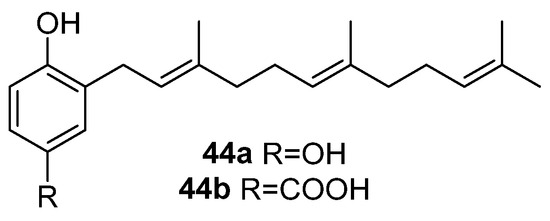 The study of methanolic extracts of D. zonaroides (undulata) confirmed the presence of two molecules (44a and 44b) (Figure 12) characterized by a phenolic structure incorporating an acyclic farnesyl lateral chain in ortho to the OH group position. The first one has an aromatic ring and two hydroxy groups in -para relative positions: 2-(3,7,11-trimethyl-2,6,10-dodecatrienyl)-hydroquinone (44a). The other, 4-hydroxy-3-(1’-((2’E,6’E)-3’,7’,11’,-trimethyl-2’,6’,10-dodecatrienyl))-benzoic acid (44b) [36], has a COOH group instead of a OH group in the meta position to the side chain. Compound 44b was first isolated from D. divaricata [15,33], and it was later obtained from Padina gymnospora in 1994 when conducting a reinvestigation of the Australian marine brown alga Perithalia caudata [37].