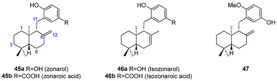 Thirteen cyclic sesquiterpene-substituted phenolic/hydroquinone structures (45–54) have been shown to be present in different brown algae. Five molecules having a 1,4 disubstituted phenolic group attached to a bicyclic sesquiterpene with no further oxygenations have been found in Dictyopteris undulata Okamura (45–47) (Figure 13). Both zonarol (45a) [36,38,39,40,41,42,43,44] and isozonarol (46a) [36,39,40,41,42] share a hydroquinone substituent linked to the C11 of an ent-drimane skeleton, although they differ in the position of the double bond in the sesquiterpene moiety. Zonaroic acid (45b) [36,38,41,43] and isozonaroic acid (46b) [41] are analogous structures to 45a and 46a, respectively, but the sesquiterpene part is attached to a 4-hydroxybenzoic acid. The monomethyl ether derivative of zonarol 47 is also present in D. undulata [43].