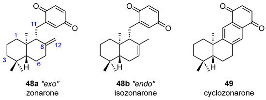 Three additional substances with a higher degree of oxidation have also been extracted from D. undulata (Figure 14). Now, the ent-drimane core has a quinone attached to the C11 position. However, while zonarone (48a) [40,42] has an exocyclic double bond, isozonarone (48b) [41,42] is the endocyclic isomer. Cyclozonarone (49) [42] has a tetracyclic structure possibly derived from a cyclization of zonarone.