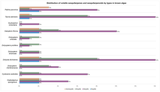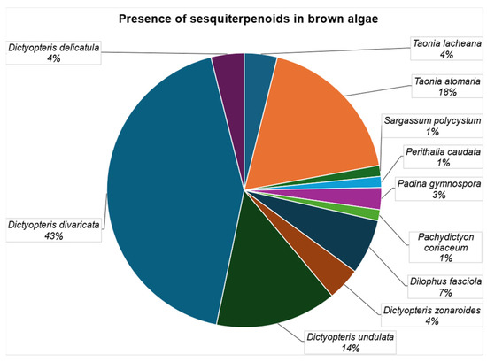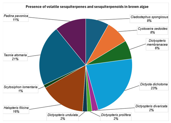 Figure 18 summarizes the presence of volatile sesquiterpenes and sesquiterpenoids in brown algae. Dictyota dichotoma (23%), Taonia atomaria (21%), and Halopteris filicina (16%) are the species that have provided the largest number of sesquiterpenes and sesquiterpenoids, although Padina pavonica (11%), Cladostephus spongiosus (8%), Cystoseira sedoides (8%), and Dictyopteris membranacea (6%) also have significant amounts.