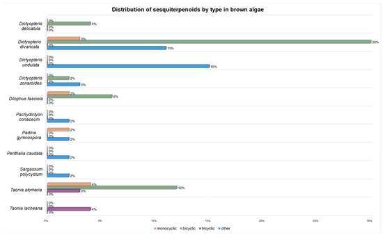 Considering the category of compounds, monocyclic sesquiterpenoids are scarcely present, with Taonia atomaria having the highest amount (4%) (Figure 17). On the other hand, bicyclic sesquiterpenoids constitute the main group. In this case, Dictyopteris divaricate (30%) and Taonia atomaria (12%) are the richest species. Tricyclic sesquiterpenoids are also scarcely abundant. Only Taonia lacheana (4%) and Taonia atomaria (3%) have produced these kinds of substances. Finally, merosesquiterpenoids and those lacking one or two atoms, classified as “others”, are mainly present in Dictyopteris undulata (15%) and Dictyopteris divaricate (11%).