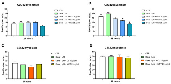 A significant reduction in cell proliferation was observed after treatment with higher concentrations of HEX (10 and 25 μg/mL) in combination with Dexa 1μM after 48 h of treatment (Figure 2B). This, in addition to a morphological change seen under the microscope, led us to hypothesize a possible anti-proliferative effect of the hexanic extract in favor of differentiation from myoblasts to myotubes (see Section 2.2.3). Dexa alone and in combination with MET and CL did not lead to a significant variation in cell proliferation in any of the two times analyzed (Figure 2C,D).