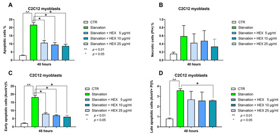 Annexin-V and PI assay. Apoptosis (total, early, and late) (panels A,C,D) and necrosis (panel B) analysis were assessed in the C2C12 cells treated with HEX at three different concentrations (5, 10, 25 μg/mL) in starvation medium. The data are reported as the mean ± S.E.M. based on three replicates for each experiment, and two independent experiments (n = 2) were conducted. Statistical analysis was carried out using non-parametric t-test, followed by a Bonferroni post hoc comparison using the GraphPad Prism 10 software. ^^ p < 0.01; * p < 0.05.