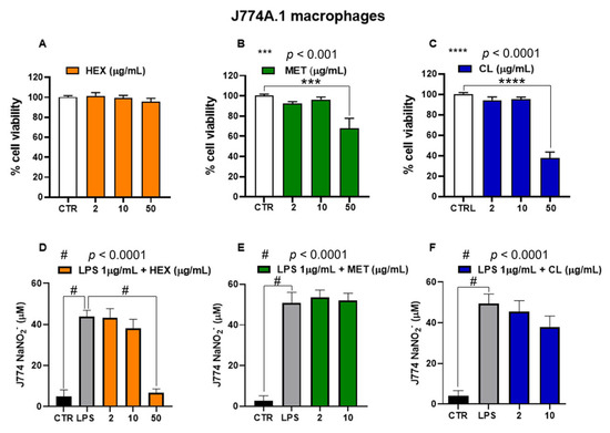 Pennatula phosphorea extracts (HEX, MET, and CL) were tested on J774A.1 macrophages at concentrations ranging from 2 to 50 μg/mL. In cells not treated with lipopolysaccharide (LPS), HEX extract did not exert cytotoxic effects at all concentrations used (2, 10, 50 μg/mL), while MET and CL reduced cell viability at the highest concentration of 50 μg/mL (Figure 6A–C). Thus, we investigated the effect of non-cytotoxic concentrations of HEX, MET, and CL on nitrite production in J774A.1 treated with lipopolysaccharide (LPS).