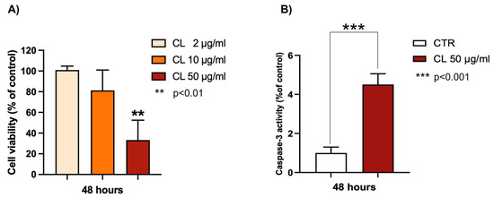 Effects of P. phosphorea chloroformic extract (CL) on (A) cell viability of melanoma A375 cells; (B) caspase-3 activity (50 μg/mL). Data are expressed as mean ± SE (n = 2, octuplicate (A); n = 2 triplicate (B)). ** p < 0.01, statistical significance between control group (untreated cells) and 50 μg CL-treated cells; *** p < 0.001.