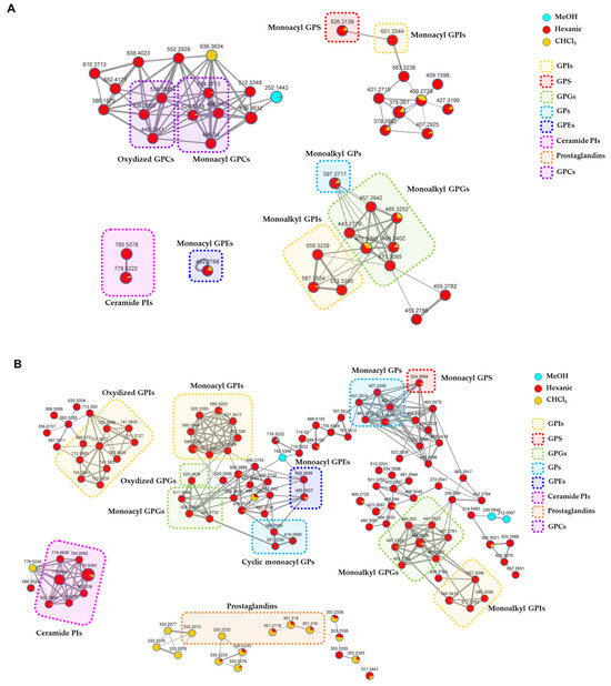 Detailed view of the annotated clusters in the molecular networks generated from LC- MS2 data of P. phosphorea extracts acquired in the positive (A) and negative (B) ion detection modes. Nodes are represented as a pie chart showing abundances of the relative precursor ion intensities in the hexanic, CHCl3, and MeOH extracts. Node size reflects metabolite peak area, while edge thickness represents the cosine score similarity of the nodes. Annotated compounds are framed and mapped with different colors according to the chemical class they belong to (GPIs = Glycerophosphoinositols; GPS = glycerophosphoserines; GPGs = glycerophosphoglycerols; GPs = glycerophosphates; GPEs = glycerophosphoethanolamines; Ceramide PIs = ceramide phosphoinositols; GPCs = glycerophosphocholines).