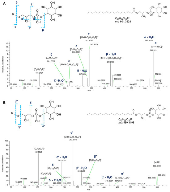 HR ESI-MS2 spectra of the [M+H]+ (A) and [M−H]− (B) ions of a representative lyso-phosphatidylinositol (GPI) from P. phosphorea (LPI 18:0).
