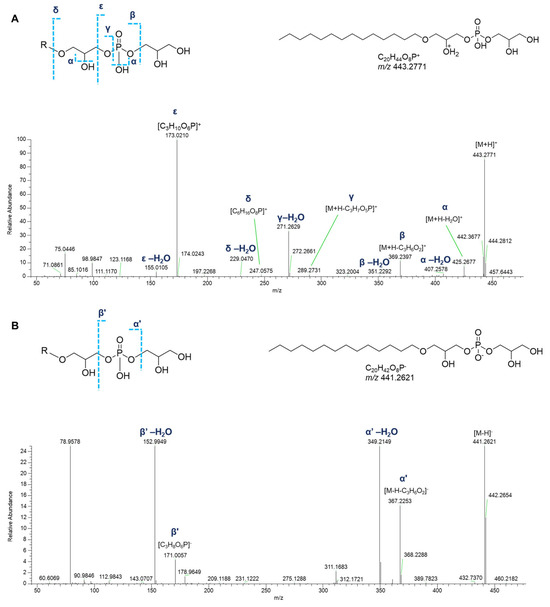 In detail, apart from the fragment ions corresponding to the neutral losses of water molecules from the phosphate group or the glycerol moiety, the product ion spectra of the [M+H]+ adducts of monoalkyl GPGs displayed the informative fragment ions of the glycerylphosphorylglycerol unit, i.e., the daughter ions at m/z 247.0577 ([C6H16O8P]+) and at m/z 173.0210 ([C3H10O6P]+) and the ions produced by their respective neutral water losses. The fragment ions generated by the elimination of the glycerophosphate moiety ([M+H-C3H7O5P]+) and of the glycerol group ([M+H-C3H6O2]+), including their dehydrated forms, allowed to shed light on the composition of the alkyl chain (Figure 10A).