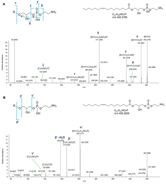 HR ESI-MS2 spectra of the [M+H]+ (A) and [M−H]− (B) ions of a representative monoacyl glycerophosphoethanolamine (GPEs) from P. phosphorea (LPE 16:1).