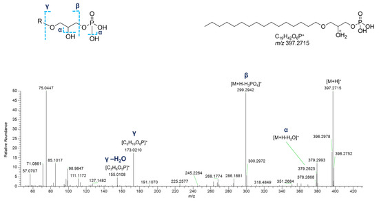 In the cluster where the majority of glycerophospholipids were grouped, several glycerophosphates (GPs), including cyclic monoacyl GPs, were detected (Table 4). Interestingly, monoalkyl GPs were only identified in positive ESI-MS HR spectra, while monoacyl GPs were only detected in the negative ones. Typical fragmentations of tandem mass spectra of the [M+H]+ ions of monoalkyl GPs comprised (a) the [M+H-H2O]+ fragment ion, (b) the [M+H-97.9769]+ peak resulting from loss of phosphoric acid (H3PO4), and (c) the glycerophosphosphoric acid fragment ([C3H10O6P]+, Figure 12).