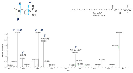 In the negative polarity mode, spectra of monoacyl GPs, in addition to the fragment ions referred to the phosphoric acid at m/z 96.9696 ([H2O4P]−) and the glycerophosphoric acid at m/z 171.0064 ([C3H8O6P]−), the daughter peak [M-H-C3H7O5P]− provided information about the fatty acid chain (Figure 13). Much simpler is the negative ion mass spectra of cyclic monoacyl GPs, showing the cyclic glycerophosphoric ion at m/z 152.9958 ([C3H6O5P]−) and the fragment resulting from the neutral loss of cyclic glycerophosphoric acid ([M-H-C3H5O4P]−) (Figure S4).