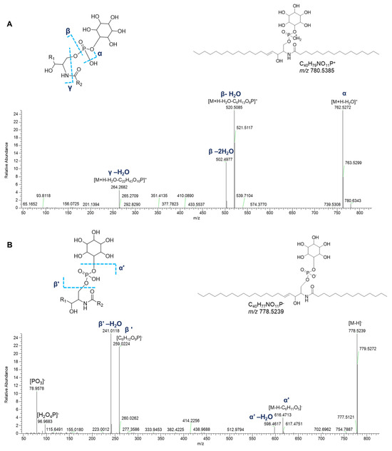 HR ESI-MS2 spectra of the [M+H]+ (A) and [M−H]− (B) ions of a representative ceramide phosphoinositol (IPC) from P. phosphorea (IPC (d18:1/16:0)).