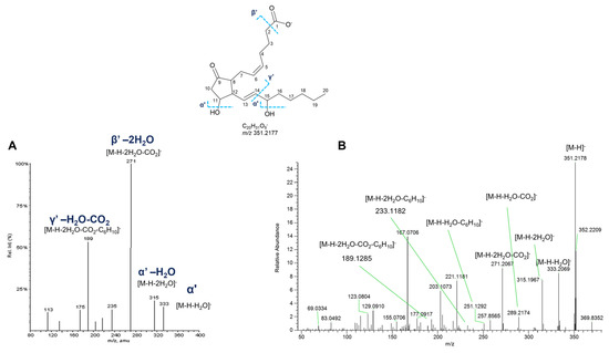 Experimental MS2 spectra of putative PGs from P. phosphorea are in agreement with the above-described fragmentation patterns, as displayed in Figure 15, showing similar product ion spectra compared with the already reported ones. However, it is impossible to distinguish unambiguously isomers with the same parent mass, i.e., the PGE2 and PGD2, by mass spectrometry, as their MS2 spectra are virtually identical. For this reason, putatively identified compounds are referred to by the LIPID MAPS shorthand notation at the species level (sum composition) (Table 8) [34].