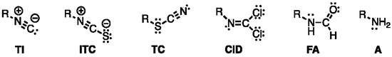 Lewis structures (closed-shell) of terpene isonitriles (TIs), ‘isonitriloids’–isothiocyanates (ITCs), thiocyanates (TCs), carbonimidic dichlorides (CIDs), and products of reaction with H2O formamides (FAs) and amines (As).