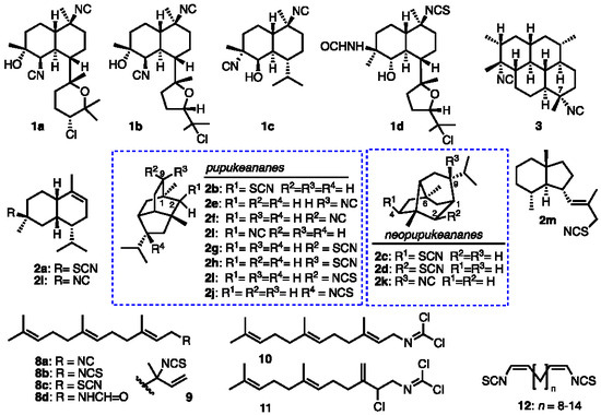 Terpenoid isonitriles (TI); kalihinols A (1a), B (1b), M (1d), and synthetic MED6-189 (1c); 7,20-diisocyanoadociane (3); and related isothiocyanates (ITCs, e.g., 1d, 2i–j, 8b and thiocyanates (TCs), 2a–d, g–k, m. bis-Isothiocyanate 12 is a non-terpenoid.