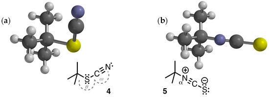 DFT-optimized molecular structures (ωB97X-D 6-31G*), dipole moments, key bond angles, and distances, d, of isomeric TC and ITC. (a) t-butylthiocyanate (4): µ = 4.48 D θthio(C-S-C) = 100.0°, dthio(C–S) = 1.88 Å; and (b) t-butylisothiocyanate (5): µ = 6.56 D, θtiso(C–Nα–C) = 176.8°, diso(C-Nα) = 1.44 Å. The major resonance form (closed-shell Lewis structure) is depicted for each.