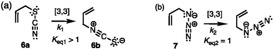 Isomerization of allylic isonitriloids, C3H5-NCS and C3H5-N3. (a) Sigmatropic [3] rearrangements: (a) allyl thiocyanate (6a) to allyl isothiocyanate (6b). (b) Degenerate rearrangement of allyl azide (7).