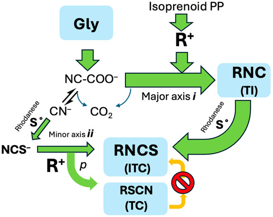 Now this enigma is addressed by the consideration of the putative interplay of three integrated biosynthetic sequelae: the capture of the terpenoid carbocation R+ by cyanoformate, NC-COOH (CF, see below [9] (itself in equilibrium with NC− and CO2 and derived from Gly), reactions promoted by co-localized rhodanese, a dual-function enzyme that can both convert inorganic NC− to thiocyanate ion, NCS− but also alkyl isonitriles to alkyl isothiocyanate (R-NC → R–NCS), and the promiscuous interception of terpenoid carbocations by co-liberated inorganic NCS−.