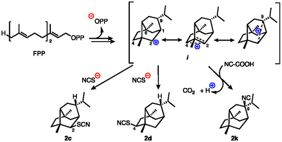 Scheme 1 leads to a unifying biosynthetic proposal for the biogenesis of TC, ITC and TI isonitriloids; for example, the three iso-morphic neopupukeanane natural products, 2c, d, k (Scheme 2), link thiocyanate and isonitrile formation. The ionization of farnesyl pyrophosphate (FPP), followed by stepwise cyclizations, as first proposed by Scheuer [15] and Opatz [1] and respective coauthors, yields stabilized incipient carbocation, i (represented in this paper by non-classical resonance forms [24,38]), which is captured by a C1 nucleophile (NCS− or NC-COOH) to yield the isonitriloids 2c, d, k. While the absolute configuration (AC) of neopupukeanane isonitriloids have not been independently assigned, 2c, d, k as depicted here conform to the rational biosynthetic proposal by Scheuer from amorphanyl cation [15] and his original assignment of the AC of the pupukeanane skeleton by CD [13].