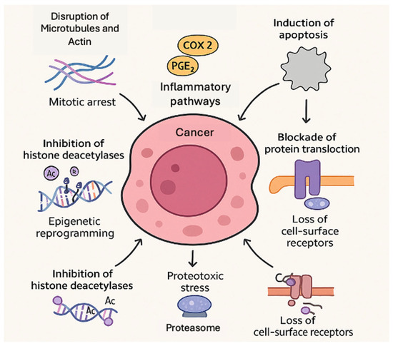 Cyanobacterial peptides exert anticancer effects through a diverse array of molecular mechanisms. These mechanisms range from physical disruption of cellular structures to biochemical modulation of signaling pathways and gene expression. This breadth of modes of action is an important advantage, as it means cyanobacterial compounds can be matched to specific tumor vulnerabilities or combined to achieve synergistic killing. Below, we outline key mechanistic categories with examples. An overview of these mechanistic categories and their effects on cancer cells is illustrated in Figure 1.