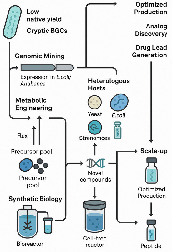 A critical challenge in developing cyanobacterial peptides as drug candidates is achieving sufficient supply and consistency. Wild cyanobacteria often produce only trace amounts of a desired compound, and large-scale cultivation can be impractical [11,101]. Moreover, the complex structures of these peptides make total chemical synthesis difficult and costly. To address these limitations, researchers are employing various biotechnological approaches—including genomic mining, heterologous expression, metabolic engineering, synthetic biology, and scalable production systems—to enhance yield and enable structural modifications. Figure 2 illustrates an overview of these key approaches.