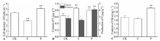 The effects of Combination C and P on fucoxanthin content and yield in P. tricornutum were examined. As shown in Figure 1, the fucoxanthin content and yield under Combination C were 0.87 ng g−1 and 2.50 ng g−1, representing 1.35-fold and 0.90-fold of the CK group, respectively. Under Combination P, fucoxanthin content and yield reached ng g−1 and 4.10 ng g−1, which correspond to 1.25-fold and 1.47-fold of the CK group, respectively. Compared with the CK group, Combination C promoted the accumulation of fucoxanthin content. However, due to the extremely significantly lower cell density in Combination C than in the CK group, the yield of Combination C decreased. Combination P promoted fucoxanthin content, and the cell density was extremely significantly higher than that of the CK group. Under the dual effects of fucoxanthin content and cell density, the yield of Combination P was extremely significantly higher than that of the CK group.