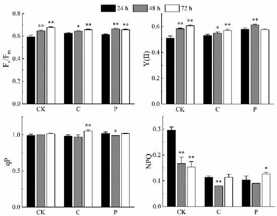 At 24 h, 48 h, and 72 h after treatment under the optimal inducer combination, NPQ, Y(II), Fv/Fm, and qP in P. tricornutum were measured according to the method described by Yiheng Song [15]. Three biological replicates were performed for each group.