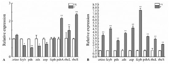 Effects of Combination C (A) and P (B) on the transcription of various genes in P. tricornutum. (A) shows the relative expression levels of key enzyme genes in the fucoxanthin synthesis pathway (crtiso, lcyb, pds, zds, zep) and key photosynthetic enzyme genes (fcpb, psbA, rbcL, rbcS) under the culture conditions of Combination C, and their comparison with those of CK. Similarly, (B) shows the relative expression levels of the above nine genes under the culture conditions of Combination P and their comparison with those of CK. “*” indicates that the relative expression level of the corresponding gene in this group (dark-colored bars) shows a significant statistical difference compared with the CK group (white bars), with a corresponding p-value less than 0.05 (p < 0.05). This suggests that the difference is unlikely to be caused by random error and is statistically signifi-cant. “**” indicates that the relative expression level of the corresponding gene in this group exhibits a highly significant statistical difference compared with the CK group, with a corresponding p-value less than 0.01 (p < 0.01). This indicates a lower probability that the difference is due to random factors, and the result is more reliable.