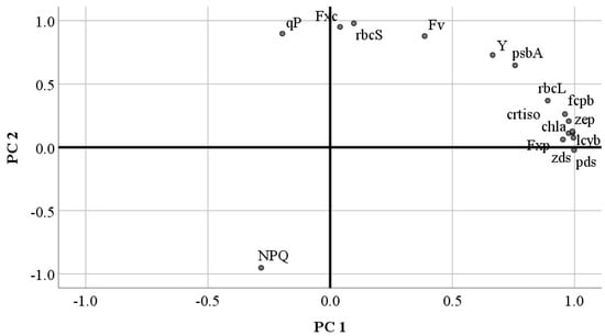 The results of the principal component analysis (Figure 4) showed that all parameters were reduced to two principal components (PC1 and PC2). PC1 was primarily associated with the pds gene, contributing 61.05% of the total variance, while PC2 was primarily associated with the rbcS gene, bringing the cumulative contribution to 96.02%. These findings indicate that pds and rbcS are the principal factors influencing fucoxanthin accumulation.