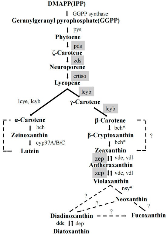 - Liang, M.H.; Zhu, J.H.; Jiang, J.G. Carotenoids biosynthesis and cleavage related genes from bacteria to plants. Crit. Rev. Food Sci. Nutr. 2018, 58, 2314–2333. [Google Scholar] [CrossRef]