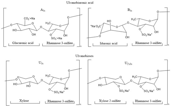 The ulvans make up 8–29% of the dry weight of the algae [9] and consist of rhamnose units (up to 45%), xylose (2.1–12%), uronic acids such as glucuronic acid and iduronic acid (6.5–19%), together with sulfate-type functional groups (16–23.2%). From the structure of the ulvan chain, two disaccharides can be distinguished as repeating units of the ulvanobiuronic type and the ulvanobiosas. The ulvanobiuronics are differentiated into type A3s corresponding to α-L-sulfated rhamnose linked by the third non-reduced carbon with β-D-glucuronic acid and type B3s, which contains iduronic acid instead of glucuronic acid. As for ulvanobiosas, the U3s type consisting of β-D-xylose bound to the fourth carbon of sulfated L-rhamnose is identified, while the U2′s3s type consists of β-D-sulfated xylose bound to the fourth carbon of α-L-rhamnose 3-sulfate (Figure 1) [10].