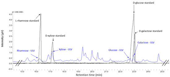 GCMS chromatogram of samples derivatized to alditol acetates. The standard monosaccharides are identified in black, and the peaks are labeled with their names. The crude ulvan sample is represented in blue, and the identified peaks are associated with the standards by their names—ULV.