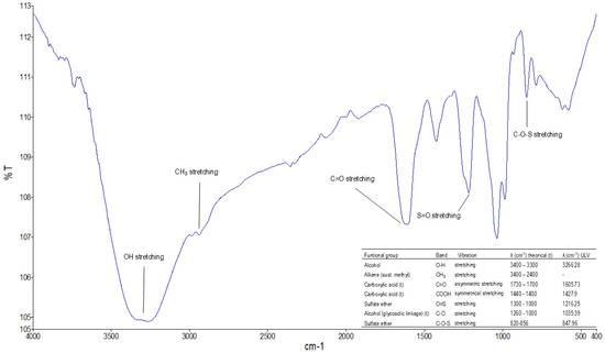 FTIR characterization confirmed the presence of characteristic functional groups in ulvans extracted from Ulva (Figure 3). The bands obtained in the crude ulvan extract coincide with those described by other studies, such as those performed by [28,34,35], which are conducted from different species of Ulva spp. The broadband marked at 3266.28 cm−1 is attributed to the stretching vibrations of the O-H group associated with the uronic acids of the molecule. The approximate band at 2900 cm−1 is related to the stretching vibrations of the CH3 groups, related to the rhamnose molecules, the main monosaccharide that composes ulvan, and was confirmed by GCMS. The band at 1605.73 cm−1 is associated with asymmetric stretching vibrations of the carboxylic group associated with glucuronic and iduronic acid, which has been described in the disaccharide A3s and B3s of the ulvanobiuronic type. In addition, the band at 1427.9 cm−1 represents the bending vibration of the carbonyl group. The bands at 1216.25 cm−1 and 847.96 cm−1 indicate the S=O stretching vibrations of the sulfate ether and C-O-S of the sulfate ester in the axial position, respectively, confirming the presence of sulfate in ulvan [15,36]. The band at 1035.39 cm−1 is related to the stretching vibrations of the C-O group in rhamnose and the angle-shift vibrations of the O-H group that would form hydrogen bridges.
