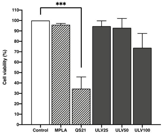 On the other hand, QS21 is an approved adjuvant for use as an AS01 formulation due to its reactivity and possible toxicity [41]. In this research, treatments with QS21 significantly reduced cell viability, reaching only 34%, which coincides with the results of other studies where dose-dependent toxicity is reported [42]. The three crude ulvan treatments achieve a higher viability than QS21, so it can be proposed as a less cytotoxic alternative that activates the immune system without causing cell death. Therefore, crude ulvan can respond without generating adverse effects as QS21.