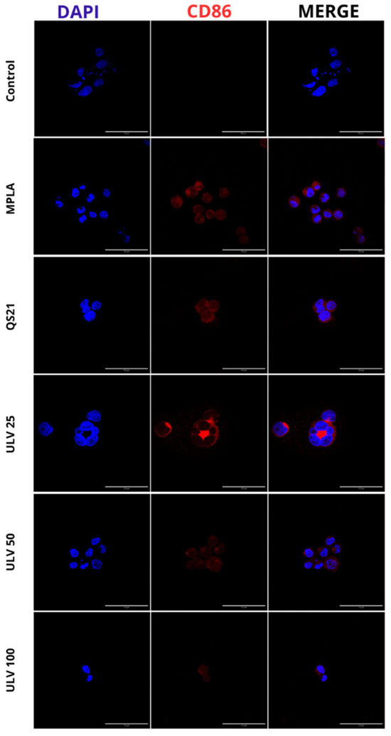 Qualitative analysis of CD86 protein expression in HL60 cell line differentiated into macrophages, incubated with different concentrations of vaccine adjuvants and crude ulvan. The indirect immunofluorescence method uses a primary antibody against CD86 and a secondary antibody, Alexa Fluor 647. The staining of membranes expressing CD86 protein in HL60 macrophage-differentiated cells is shown in red. The cell nuclei stained with DAPI are shown in blue.