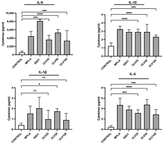Cytokine expression in the HL60 cell line differentiated into macrophages, incubated with different concentrations of vaccine adjuvants and crude ulvan. The data represent the mean ± standard deviation of three independent experiments. Statistical significance was established with * p > 0.05; *** p < 0.01; **** p < 0.001; ns indicates not significant.