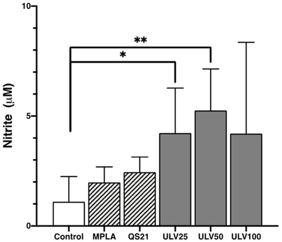 Nitric oxide expression in the HL60 cell line differentiated into macrophages, incubated with different concentrations of vaccine adjuvants and crude ulvan. The data represent the mean ± standard deviation of three independent experiments. Statistical significance was established with * p > 0.05; ** p > 0.01.