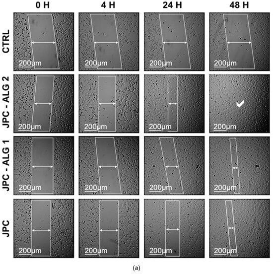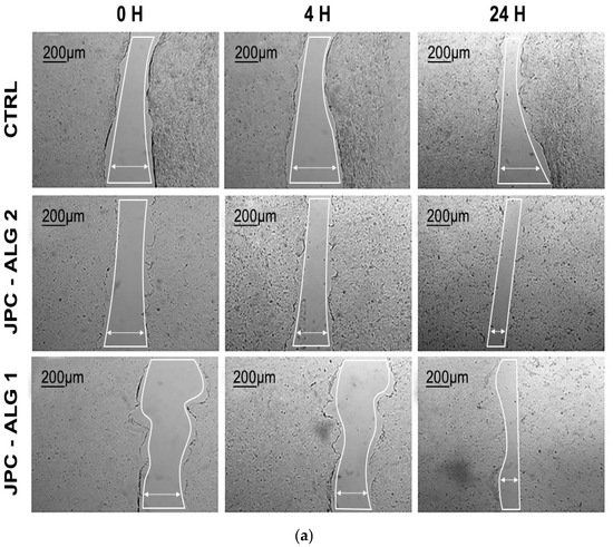 The scratch test is a well-established in vitro method used to mimic wound healing by mechanically creating a gap in a confluent monolayer of cells. This assay models the migration and proliferation of cells toward the wound site, as demonstrated by Migone et al. (2022) and Morgner et al. (2022) [63,65]. In this study, a standardized scratch was made using a pipette tip to simulate tissue injury. To minimize the influence of cell proliferation and focus on migratory behavior, the assay was conducted in a medium containing low serum (1% FBS), in accordance with the recommendations by Grada et al. (2017) [66]. The effects of JPC, JPC-ALG 4, and JPC-ALG 2 on fibroblast migration were evaluated by monitoring wound closure at 4, 24, and 48 h post-injury (Figure 11a).