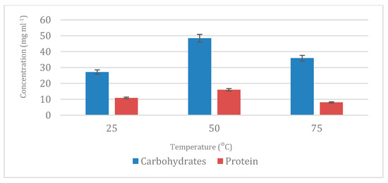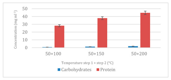 27]. Therefore, the integrated process was performed in three sequential steps using pure water at different temperatures (25–200 °C), and pure ethanol at 120 °C. Carotenoids and carbohydrates extraction was optimized using low temperatures (25–75 °C); then, temperature extraction was evaluated for protein and residual carotenoids extraction (100–200 °C). This way, three valuable isolated fractions were obtained from the microalgae biomass.