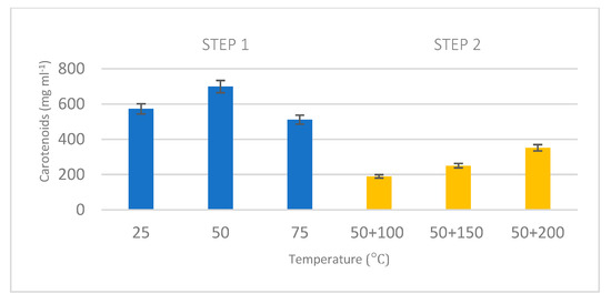 34]. Regarding carotenoid extraction, carotenoids were extracted when high temperatures were used, and the content improved as the process raised the operational temperature [