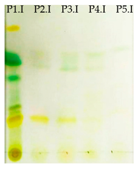 Thin-layer chromatography (TLC) was used to analyze carotenoids. A chromatographic silica plate was cut, and 1 cm (approx.) of mobile phase was added to the chromatographic chamber (Petroleum ether phase: acetone, 75:25). Then, 10 μL of the dissolved extracts of the different solvents was added together with a known Rf marker standard (β-carotene, 500 ppm concentration in isopropanol). Samples must be above the mobile phase line. The mobile phase was allowed to elute until the solvent front reaches ~1 cm from the edge of the plate (approximately 20 min).