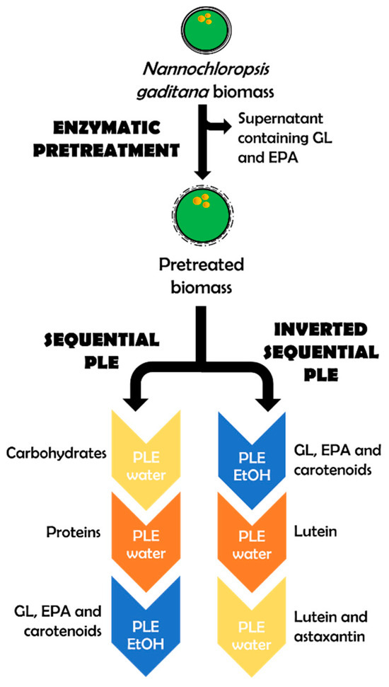 This work brings several novel contributions to the field of algal biorefinery. First, it demonstrates for the first time the selective recovery of pure glycolipids during enzymatic pretreatment without the need for organic solvents, revealing a previously discarded high-value fraction. Second, it compares two novel sequential extraction strategies (direct and inverted PLE), offering versatile tools depending on the target compounds, and enabling complete biomass depletion. Third, it provides a scalable, solvent-efficient method using only ethanol and water under pressurized conditions to obtain fractionated extracts rich in EPA, lutein, and astaxanthin. To our knowledge, this is the first report that integrates enzyme-assisted extraction, sequential PLE, and inverted PLE in a unified, sustainable workflow applied to N. gaditana, with demonstrated potential for circular bioeconomy applications.