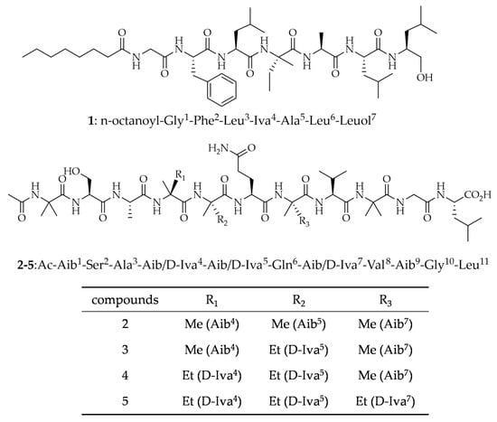 - Chugh, J.K.; Wallace, B.A. Peptaibols: Models for Ion Channels. Biochem. Soc. Trans. 2001, 29, 565–570. [Google Scholar] [CrossRef] [PubMed]