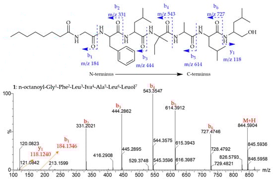 Compound 1 was obtained as a brown amorphous solid and assigned the molecular formula C45H77N7O8 based on HRESIMS (m/z 844.5904 [M + H]+). The protonated ion of 1 in the tandem mass experiment produced a series of b- and y-type daughter ions. The appearance of b-type ions at m/z 727.4746 (b6), 614.3912 (b5), 543.3547 (b4), 444.2862 (b3), 331.2021 (b2), and 184.1346 (b1) provided successive neutral loss of Leuol7, Leu6, Ala5, Iva4, Leu3, and Phe2 from the C-terminus (Figure 2), respectively, establishing the partial amino acid sequences Phe2-Leu3-Iva4-Ala5-Leu6-Leuol7. The fragment ion y1 at m/z 118.1240 also supported the presence of Leuol7 (leucinol) at the C-terminus. The 1H NMR spectrum (Table 1, Figure S2) showed seven NH protons in the region of δH 6.8–8.4, five aromatic protons at δH 7.19–7.26, five α-H protons at δH 3.6–4.6 and a long acyl chain (CH2)n moiety at δH 1.25, which are characteristic signals for lipopeptides [,,]. The 13C and DEPT135 NMR data (Figures S3 and S4) revealed the presence of 45 carbons assigned as seven carbonyls, two quaternary carbons, thirteen methines, thirteen methylenes, and 10 methyl carbons. The COSY, HMBC, HSQC, and TOCSY experiments of 1 (Figures S5–S8) produced spin systems that were easily assigned for an n-Oct (n-Octanoyl) chain, one Gly (glycine), one Phe (Phenylalanine), one Iva, one Ala (Alanine), one Leuol (Leucinol), and two Leu (Leucine) residues. The NH (δH 8.15) and α-CH2 (δH 3.73 and 3.52) of Gly showed NOESY correlations with α-CH2 (δH 2.10) of the octanoyl group, suggesting that the n-Oct chain tethered with Gly. Thus, the first amino acid residue at the N-terminus should be Gly. The HMBC correlations from the NH protons to the two flanking carbonyls, as well as the NOESY correlations between NH protons of the two adjoining residues, helped in the establishment of the complete sequence of 1 as Octanoyl-Gly1-Phe2-Leu3-Iva4-Ala5-Leu6-Leuol7, designated lipotrichaibol A.