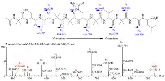 Compound 2 was isolated as a white amorphous solid. The molecular formula of 2 was determined to be C46H80N12O15 based on the HRESIMS (m/z 1041.5914 [M + H]+) (Figure 3), accounting for 13 degrees of unsaturation. The 1H NMR data (Table 2) exhibited thirteen amide protons in the range δH 6.50–9.00, seven α-H at δH 3.65–4.25, and numerous overlapping proton signals between 1.47 and 1.60 ppm comprising 12 methyl signals. The 13C and DEPT NMR data revealed the presence of 46 carbons assigned as thirteen carbonyls, five quaternary carbons, seven methines, five methylenes, and sixteen methyl carbons. Interpretation of the 1H-1H COSY, HSQC, and HMBC data (Figures S15–S17) established eleven amino acid residues, including one Ser (Serine), one Ala (Alanine), one Gln (Glutamine), one Val (Valine), one Gly (Glycine), five Aib (α-Aminoisobutyric acid), along with an Ac (Acetyl) moiety at the N-terminus, and one Leu (Leucine) residue at the C-terminus. The key NOESY signals (Figure 4), which began from the methyl protons (δH 1.90) at the Ac moiety to the subsequent amide protons NH-1 (δH 8.64, Aib1)/NH-2 (δH 8.18, Ser2), NH-4 (δH 7.83, Aib4)/NH-5 (δH 7.55, Aib5), NH-6 (δH 7.90, Gln6)/NH-7 (δH 7.68, Aib7)/NH-8 (δH 6.93, Val8)/NH-9 (δH 7.56, Aib9), NH-10 (δH 7.82, Gly10)/NH-11 (δH 7.48, Leu11), helped to string up the full sequence of 2 as Ac-Aib1-Ser2-Ala3-Aib4-Aib5-Gln6-Aib7-Val8-Aib9-Gly10-Leu11. The sequence of 2 was also supported by the ESIMS2 fragments for the protonated ion at m/z 1041.5914 [M + H]+. The daughter ions (Figure 3) at m/z 286.1398, 371.1921, 456.2451, 584.3033, 669.3566, 768.4248, 853.4774, and 910.4990 are in accordance with the above-proposed sequence for 2, designated trichoderpeptide A.