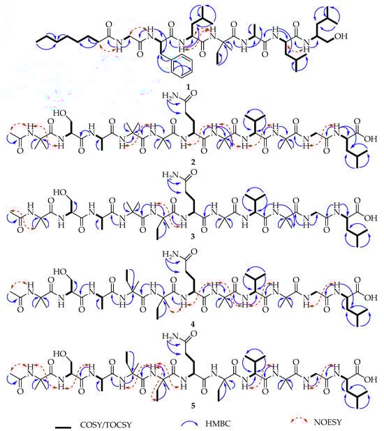 Key COSY/TOCSY, HMBC, and NOESY correlations of compounds 1–5.
