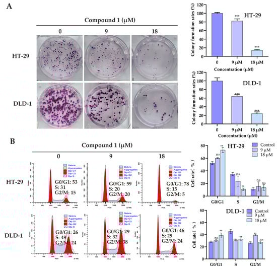 The effect of compound 1 on the proliferation and colony growth of colorectal cancer cells. (A) Colony formation assay for detecting cell proliferation of HT-29 and DLD-1 cells treated with compound 1. Results are expressed as mean ± SD (n = 3). ***, p < 0.001. (B) Flow cytometry of cell cycle in HT-29 and DLD-1 cells treated with 9 and 18 μM compound 1 for 24 h. ns, not significant, ** p < 0.01, ***, p < 0.001, compared to the control group.