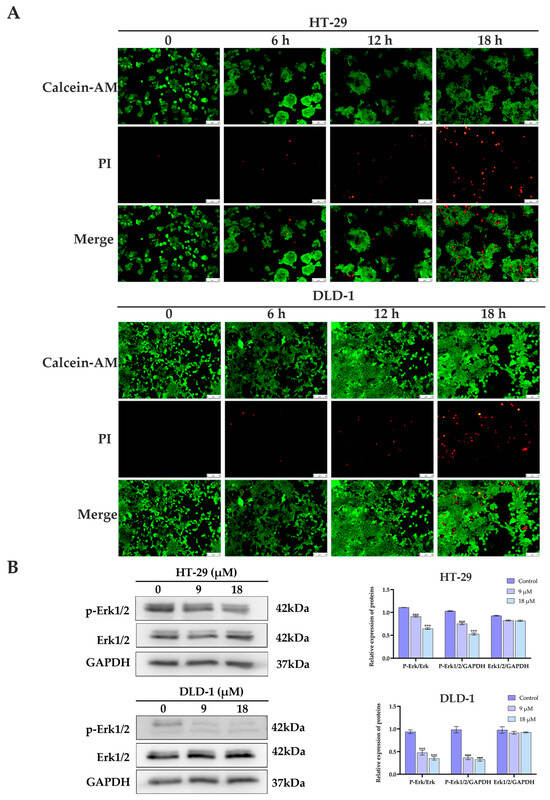 For the Calcein-AM/PI staining assay, DLD-1 and HT-29 cells were seeded in 24-well plates at 5 × 104 cells per well. After 24 h of culture, the 1640 medium was replaced with a medium containing compound 1 (18 μM). After incubation for 0, 6, 12, and 18 h, cells were stained by using the calcein AM (MedChem Express (Monmouth Junction, NJ, USA), 5 μM) and propidium iodide (MedChem Express, 50 μg/mL). The cells were incubated in the dark at 37 °C for 30 min, followed by imaging with an inverted fluorescence microscope.